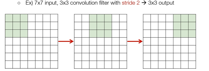 이미지에 대해 필터를 적용할 때는 필터의 이동량을 의미하는 스트라이드 (stride)를 설정해야한다. 즉 한 번의 Convolution 연산 이후 옆으로 이동할 때 몇 칸 이동할 지에 대한 부분이다.