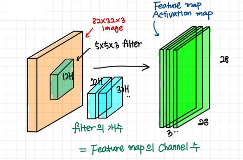 특징은 여러개 존재하므로 Filter은 여러개가 될 수 있다. Filter의 개수 별로 Feature map도 하나씩 증가한다.