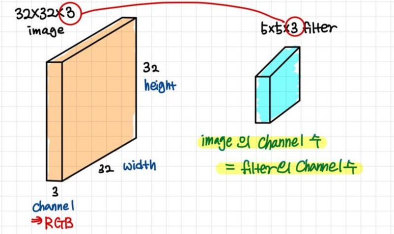 입력으로 들어오는 image의 채널 수 = Filter의 채널 수