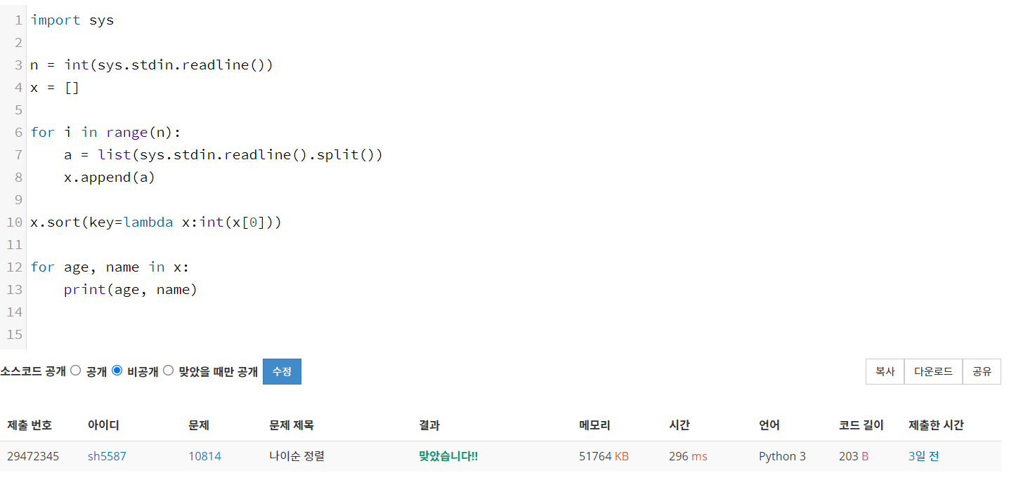 10814번: 나이순 정렬