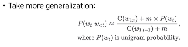 - But, unseen word sequence를 위해 back-off를 거치는 순간 확률 값이 매우 낮아져 버린다.