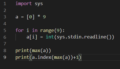 9개의 서로 다른 자연수가 주어질 때, 이들 중 최댓값을 찾고 그 최댓값이 몇 번째 수인지를 구하는 프로그램을 작성하시오.