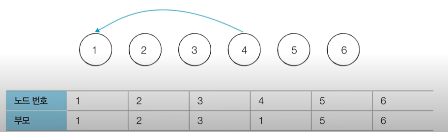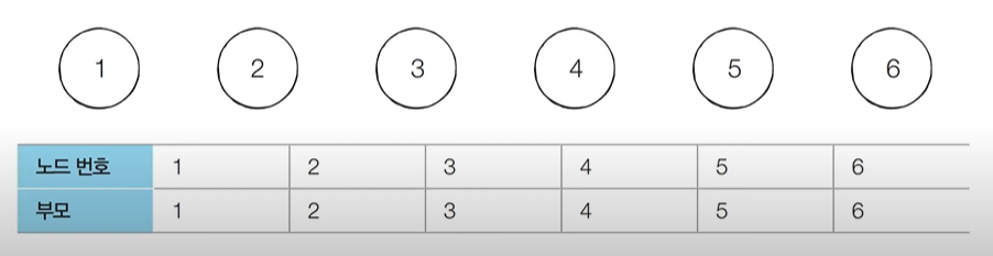 [초기 단계] 모든 노드에 대하여 자기 자신을 부모로 설정하는 형태로 부모 테이블 초기화