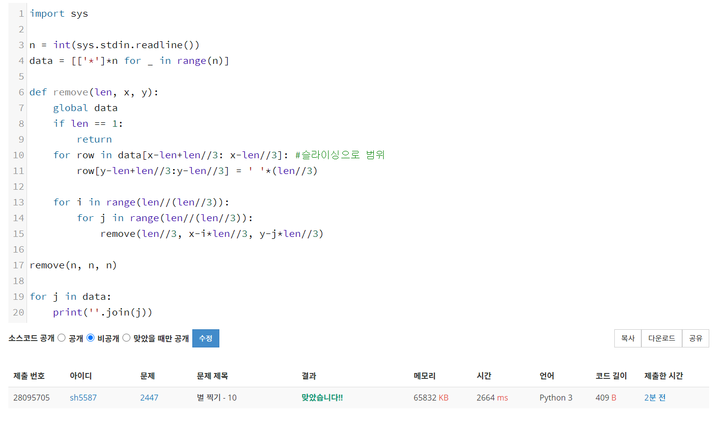 N이 3보다 클 경우, 크기 N의 패턴은 공백으로 채워진 가운데의 (N/3)×(N/3) 정사각형을 크기 N/3의 패턴으로 둘러싼 형태이다. 예를 들어 크기 27의 패턴은 예제 출력 1과 같다.