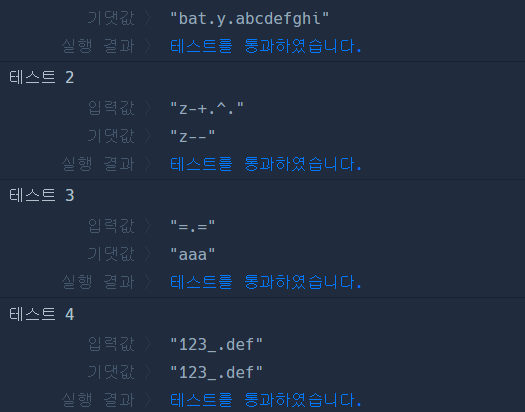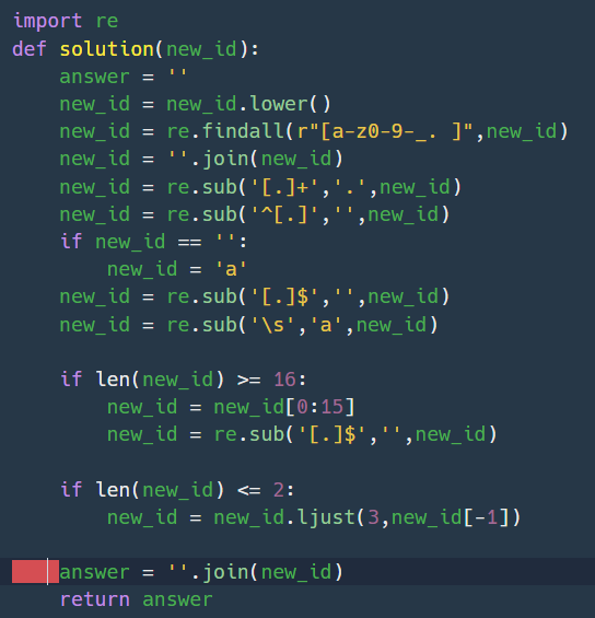 re.sub('^[.]|[.]$','',new_id)와 같은 방법으로 맨 앞 또는 맨 뒤가 . 인 경우를 한 줄로 코드를 구현할 수 있었다.