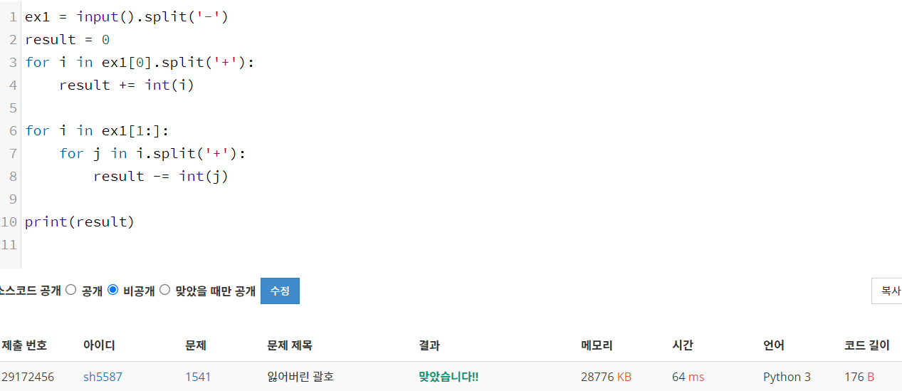 첫째 줄에 식이 주어진다. 식은 ‘0’~‘9’, ‘+’, 그리고 ‘-’만으로 이루어져 있고, 가장 처음과 마지막 문자는 숫자이다. 그리고 연속해서 두 개 이상의 연산자가 나타나지 않고, 5자리보다